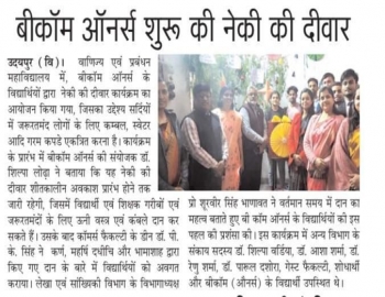 Presently College runs four Under Graduate Programmes – B. Com., B. Com. Honours, B. B. A. and B. Voc. College has two premises one at Saraswati Marg where all the programmes except BBA of the college are run and one is Vanijya Bhawan (inside University campus) where B. B. A. Programme is run. All the departments together run seven regular PG Programmes, three non-collegiate PG Programmes, several certification programmes.